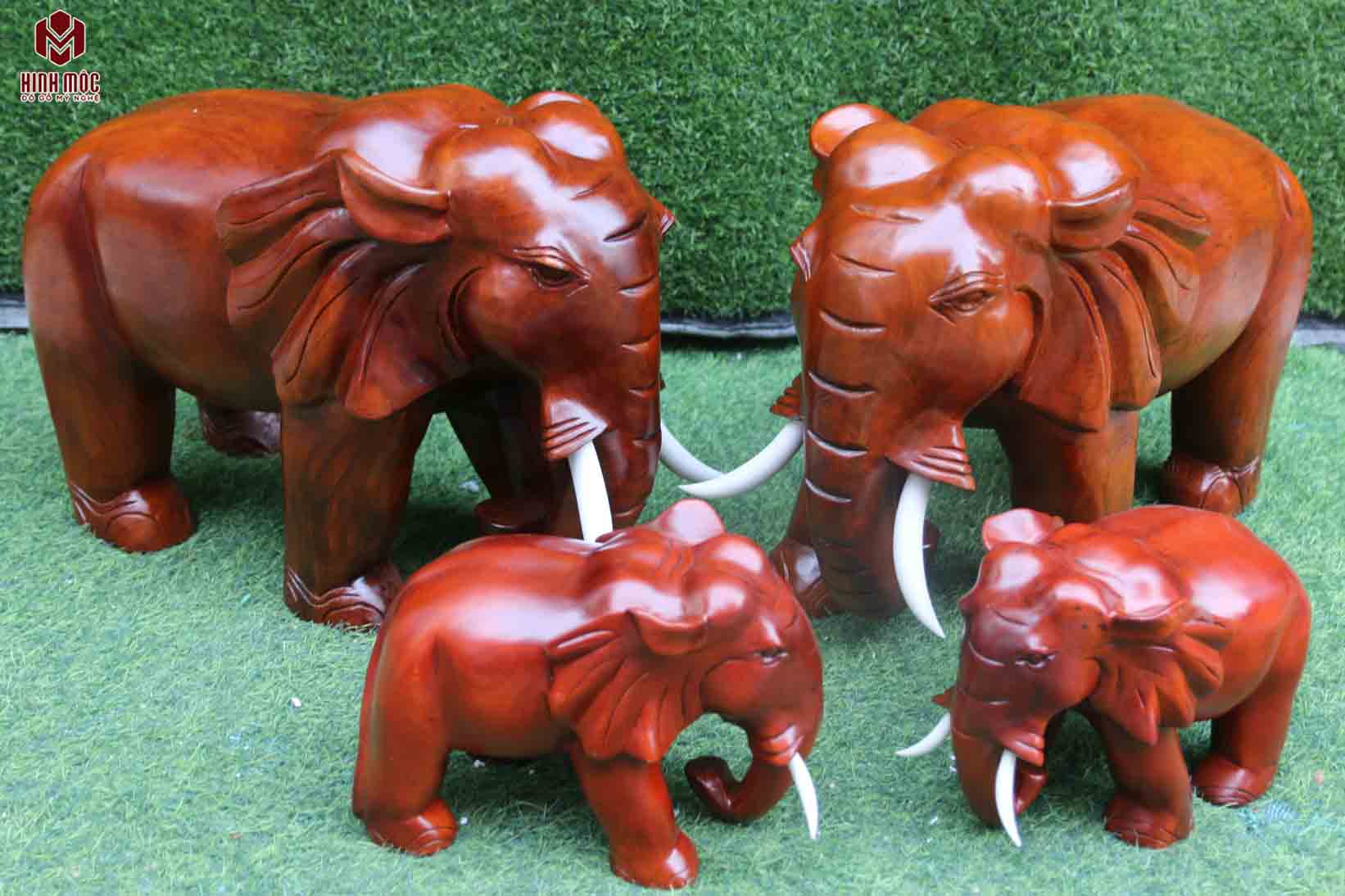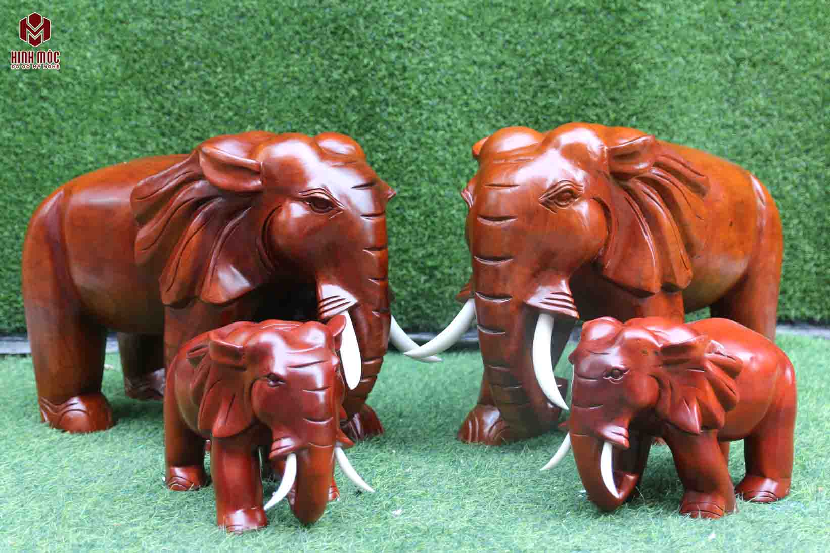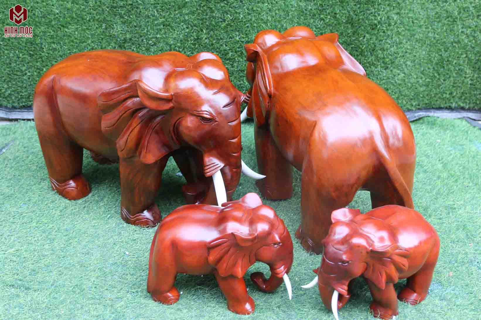 Tượng gia đình voi thực sự là 1 tác phẩm độc đáo và ý nghĩa. Bộ tượng gồm 4 con voi, cặp voi bố mẹ và 2 voi con. Tác phẩm đục máy, sửa tay trên gỗ xà cừ đỏ, gỗ lõi, hấp sấy bằng lò công nghiệp. Đảm bảo 100% không nứt nẻ, co ngót. Bộ tượng được sơn lót và phun sơn P.U hiện đại, nên màu nâu đỏ cánh gián, sang trọng và bền màu. Không có nhiều chi tiết được đục chạm cầu kì, nhưng lại đem đến sự bền vững, chắc khỏe đúng với tinh thần của tác phẩm.