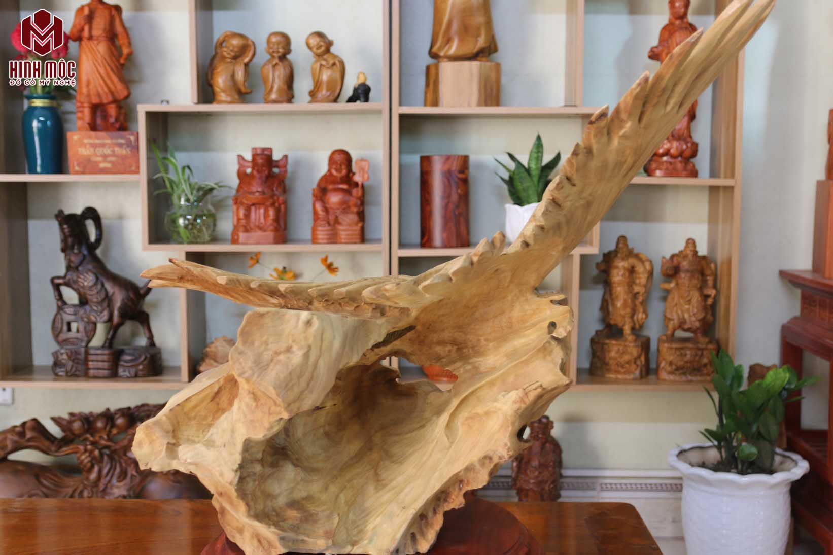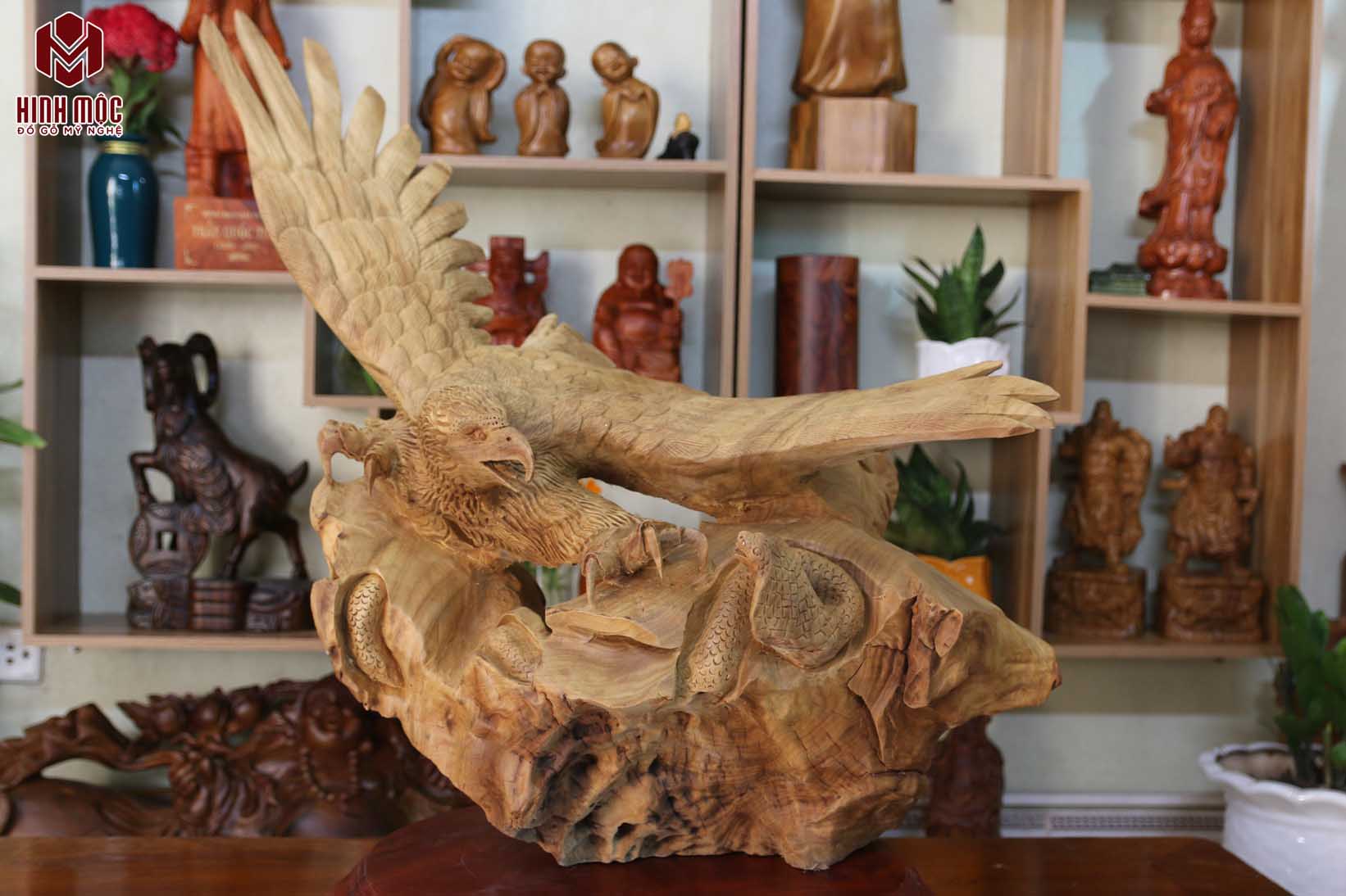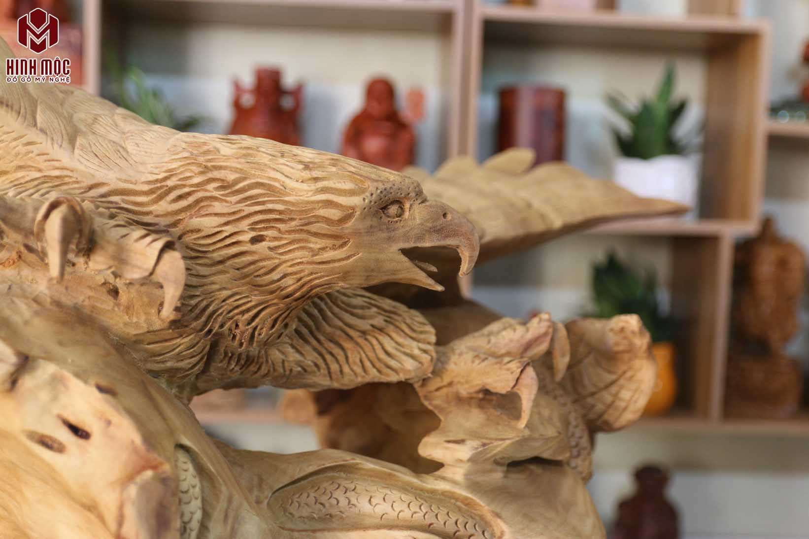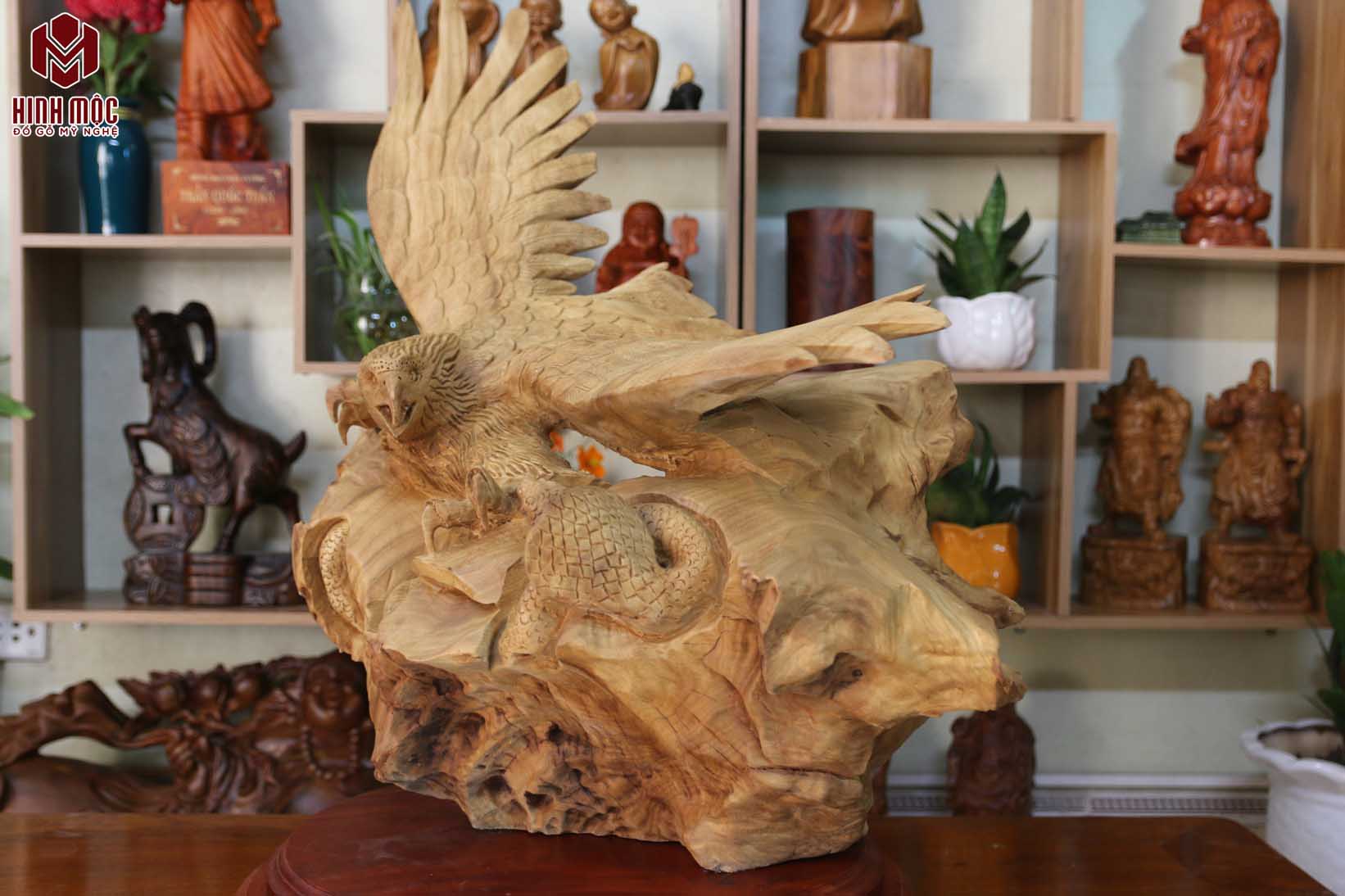 Tác phẩm được nghệ nhân làng nghề mộc Đông Giao - Hải Dương đục tay 100%, đục trên gỗ xá xị gốc liền khối. Tượng mô tả lại cuộc chiến đấu ngang tài ngang sức giữa đại bàng và rắn. Đại bàng bay trên cao và con rắn luồn lách phía dưới.