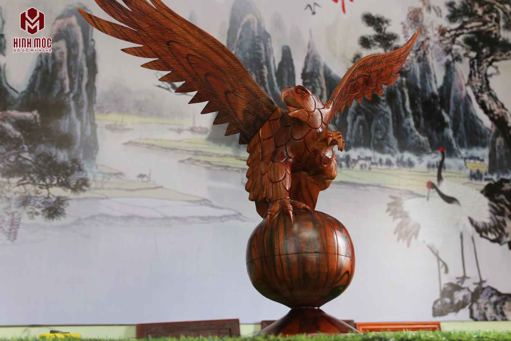 Đại bàng được tạo hình trên gỗ xà cừ lõi. Gỗ xà cừ Đại Từ - Thái Nguyên rất đẹp. Tượng đục bằng máy CNC, sắc nét. Tạo hình hình ảnh con đại bàng đậu trên quả địa cầu, chân co chân duỗi. Mỏ sắc, mắt tinh nhìn xa dữ dội.