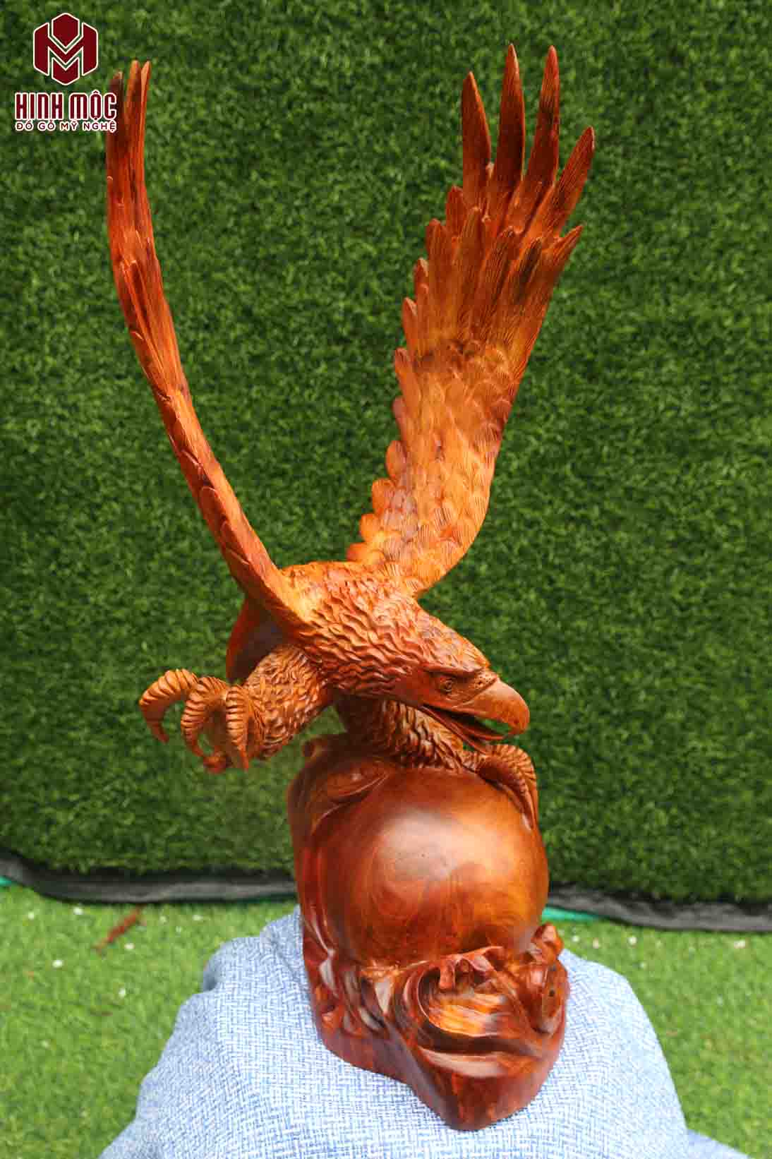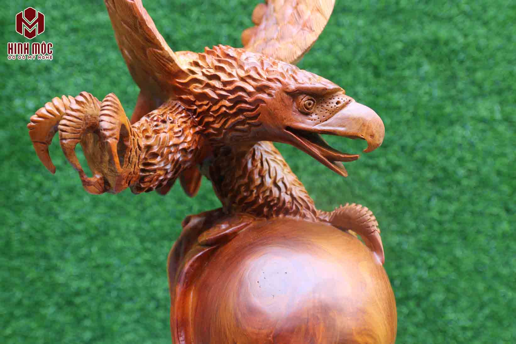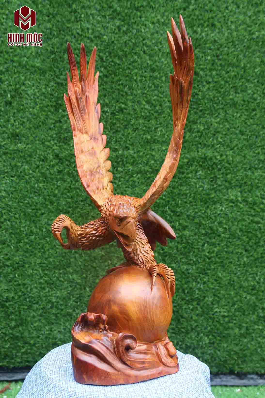 Tượng đục trên gỗ hương ta (hương Gia Lai). Gỗ đỏ đẹp, nhiều vân, không rác. Từ đặc điểm tự nhiên của khối gỗ mà nghệ nhân đã sáng tạo nên hình ảnh con đại bàng đang tung cánh vồ mồi, chân đạp trên quả cầu lớn. Các chi tiết, đường nét trên tác phẩm đều được nghệ nhân hoàn thiện với độ sống động cao, mềm mại, chân thực.