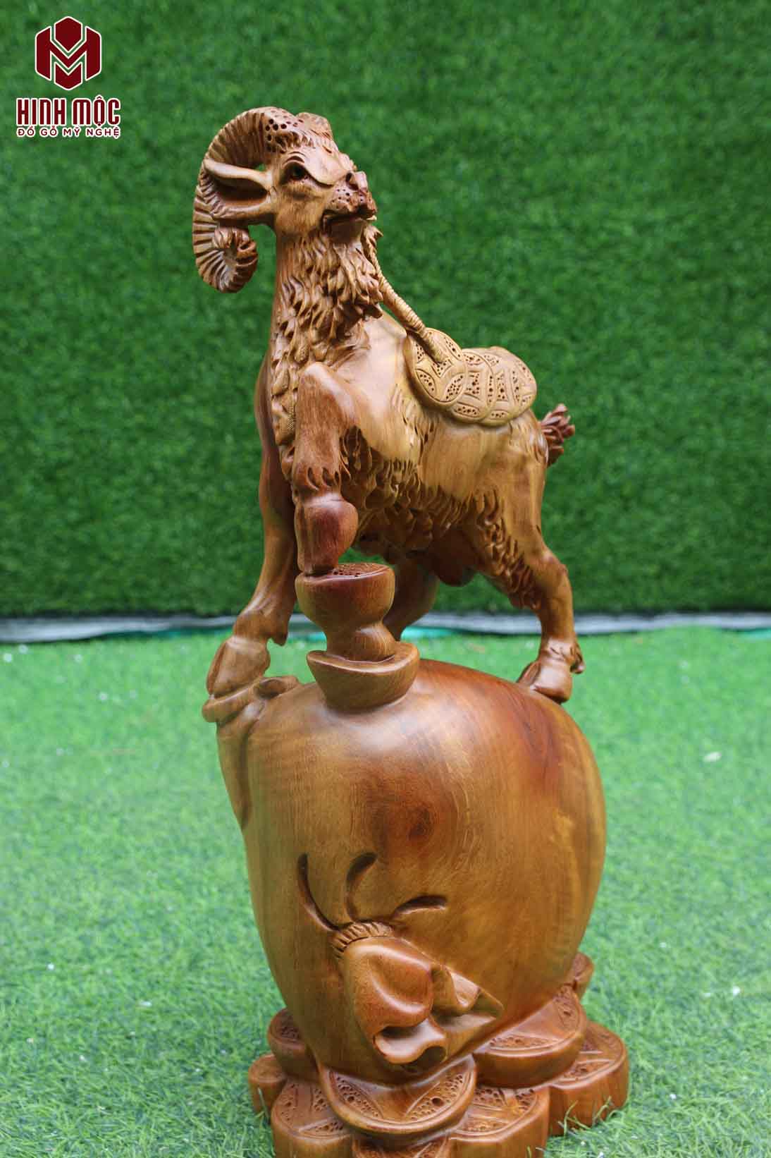 Tượng mô tả lại hình ảnh của con dê núi đang đứng trên bao tiền vàng chật cứng tài lộc. Đường đục hoàn hảo, tỉ lệ cân đối, chất gỗ đẹp, thơm cho ta 1 tác phẩm phong thủy tuyệt vời, xứng đáng để rước về cầu tài lộc.