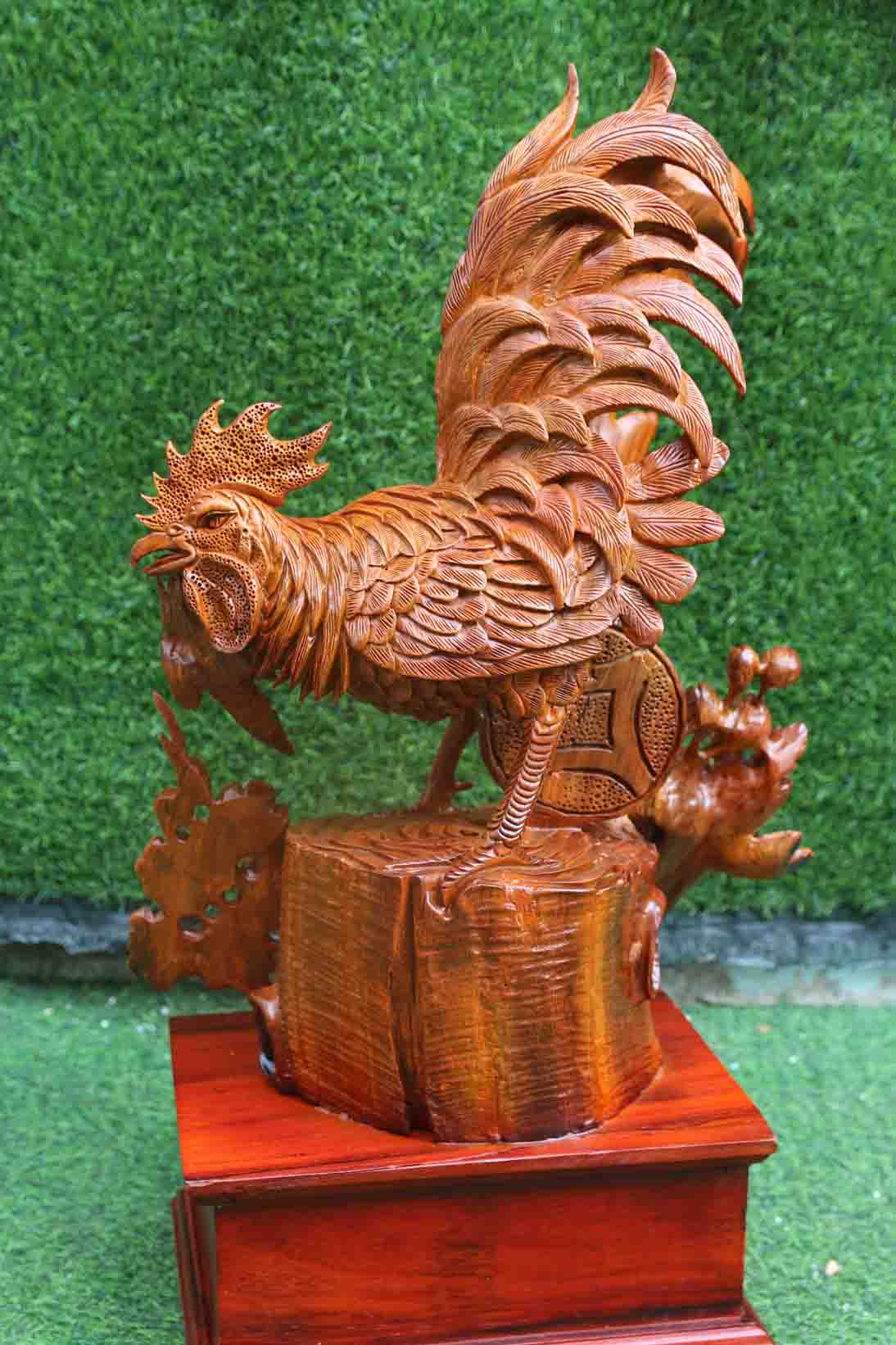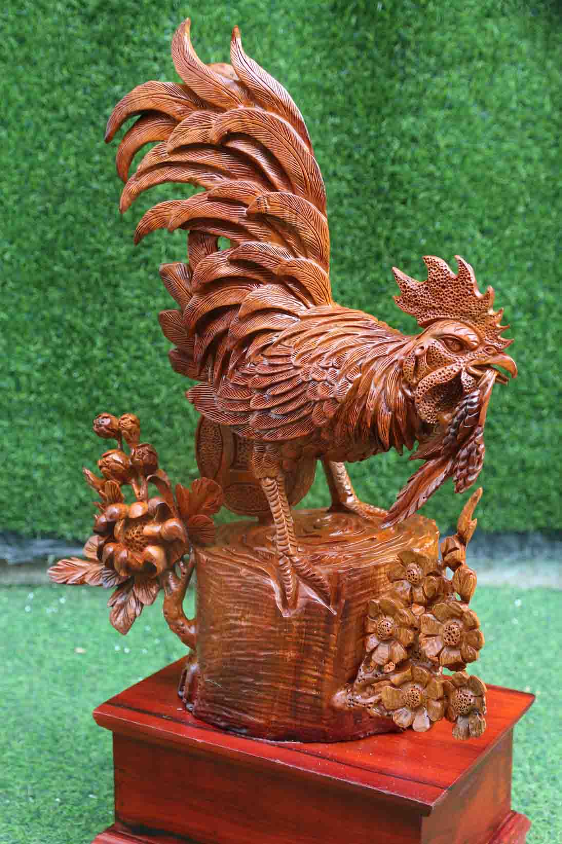Tượng gà trống kiếm mồi được đục trên gỗ hương ta. Gỗ đỏ, nặng thơm phức, nghệ nhân giàu kinh nghiệm chế tác, hoàn thiện tới từng chi tiết nhỏ. Tượng ghi lại hình ảnh con gà trống mạnh khỏe, rắn chắc đang đứng trên gốc cây, miệng ngậm theo chùm hạt kê, bên cạnh là khóm hoa cúc truyền thống. Đây là hình ảnh vừa chân thực, sinh động lại vừa ý nghĩa.