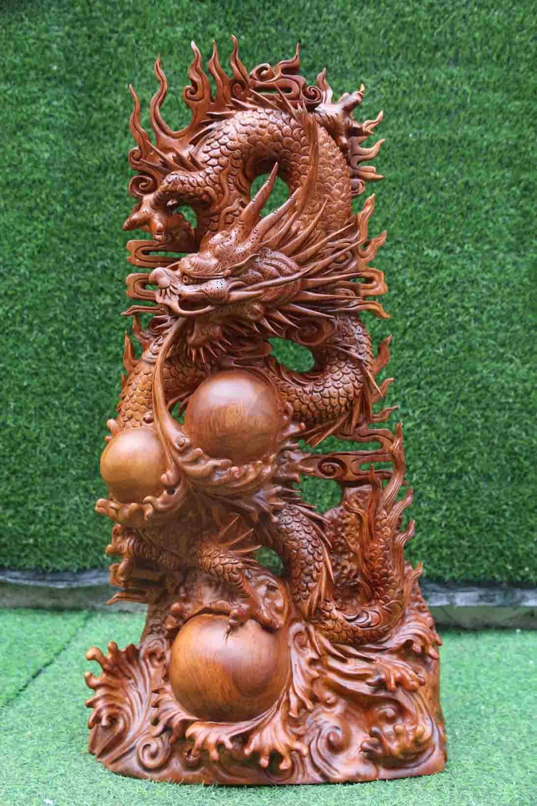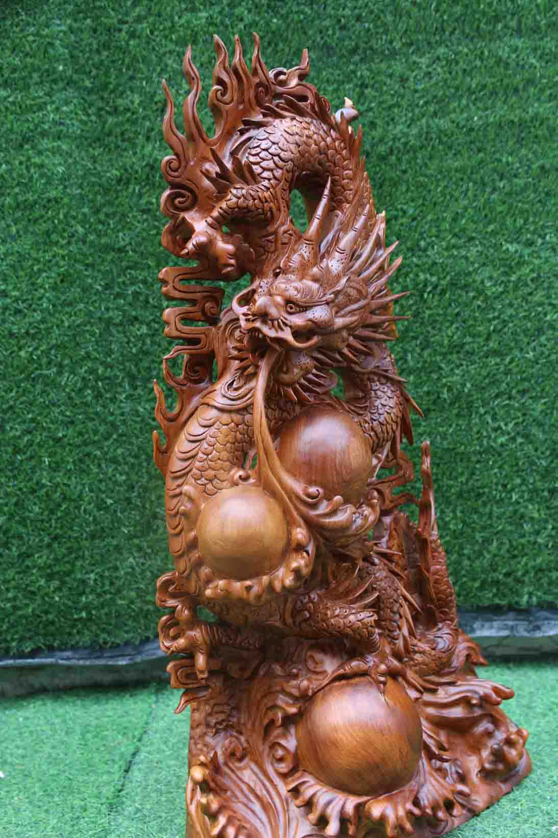 Tác phẩm do nghệ nhân đục tay, gỗ hương Việt Gia Lai liền khối. Đục tay xảo, thần thái, tạo hình con rồng uốn lượn, miệng phun nước, chân cắp chặt viên ngọc minh châu. Tác phẩm thơm nức mùi thơm tự nhiên, kích thước chuẩn theo phong thủy Lỗ Ban. Cao 81 ngang 47 sâu 16cm.