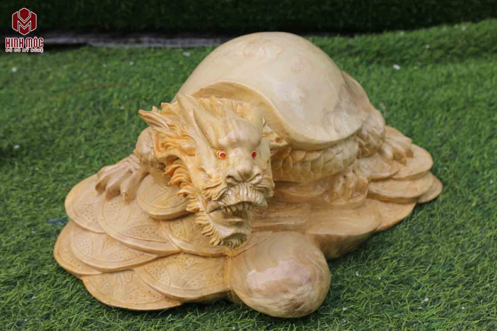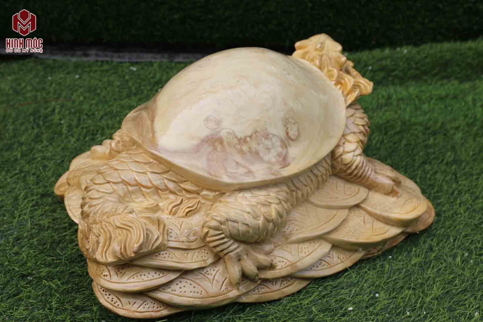 Cụ Long Quy rùa đầu rồng này được nghệ nhân đục tay hoàn toàn. Đục đẹp, sắc nét, thần thái. Tạo hình cân đối, hài hòa với hình ảnh cụ Long Quy đạp trên đống tiền vàng lớn, miệng há rộng, lưng rùa bền chắc.