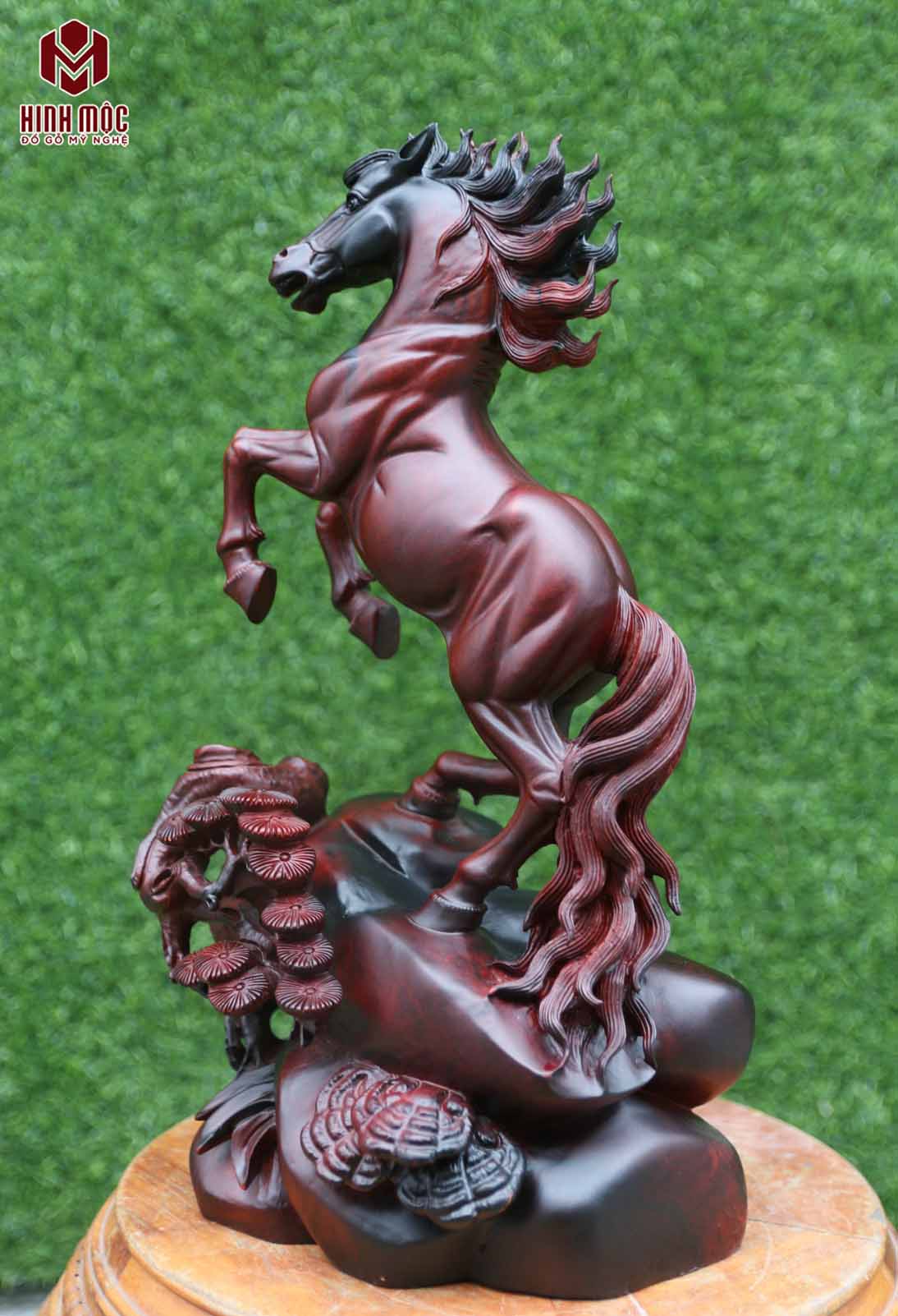 Ngựa được nghệ nhân đục tay hoàn toàn. Gỗ trắc đỏ đen liền khối. Đục cực đẹp, thần thái, tinh xảo. Tượng mô tả lại hình ảnh con ngựa đứng trên núi đá, phía dưới có cây tùng bách cổ thụ. 2 chân tung vó, miệng hí vang mừng chiến thắng.