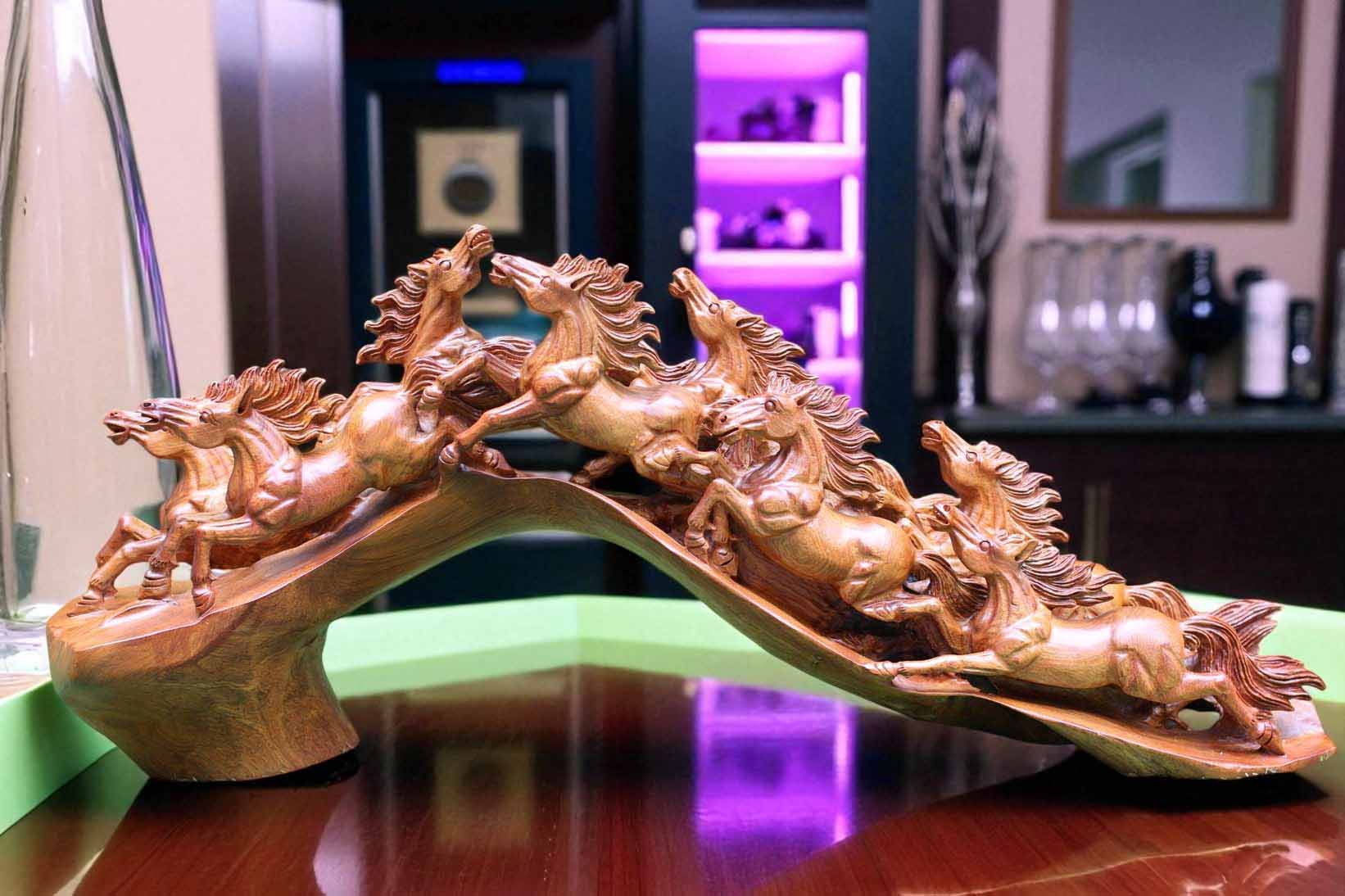 Tượng đục tay nghệ nhân, gỗ hương ta liền khối. Gỗ đẹp, nạc hết, dày dặn, cân đối. Tạo hình hình ảnh 8 con ngựa quý (bát mã) đang chạy đua trong gió. Nghệ nhân đục tay, gia công tinh xảo, thần thái và chi tiết. Tượng cao 38cm, chiều dài chính xác là 89cm, chiều sâu 22cm, đẹp hoàn hảo không lỗi lầm.