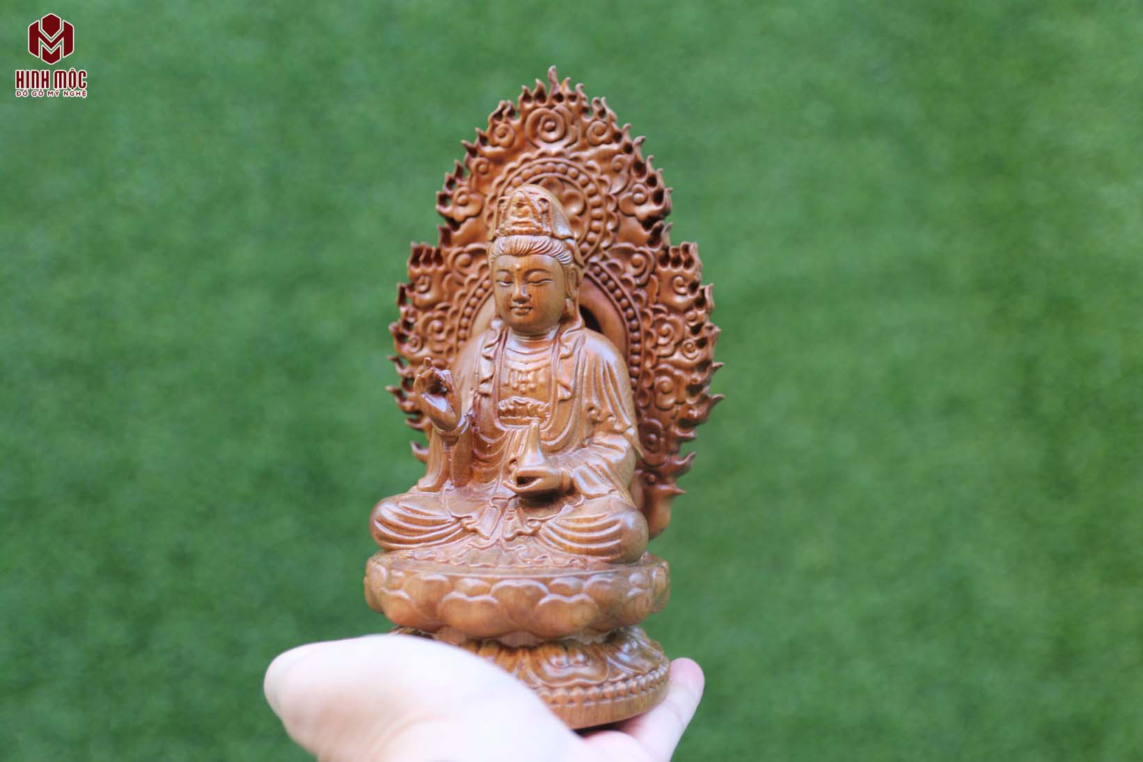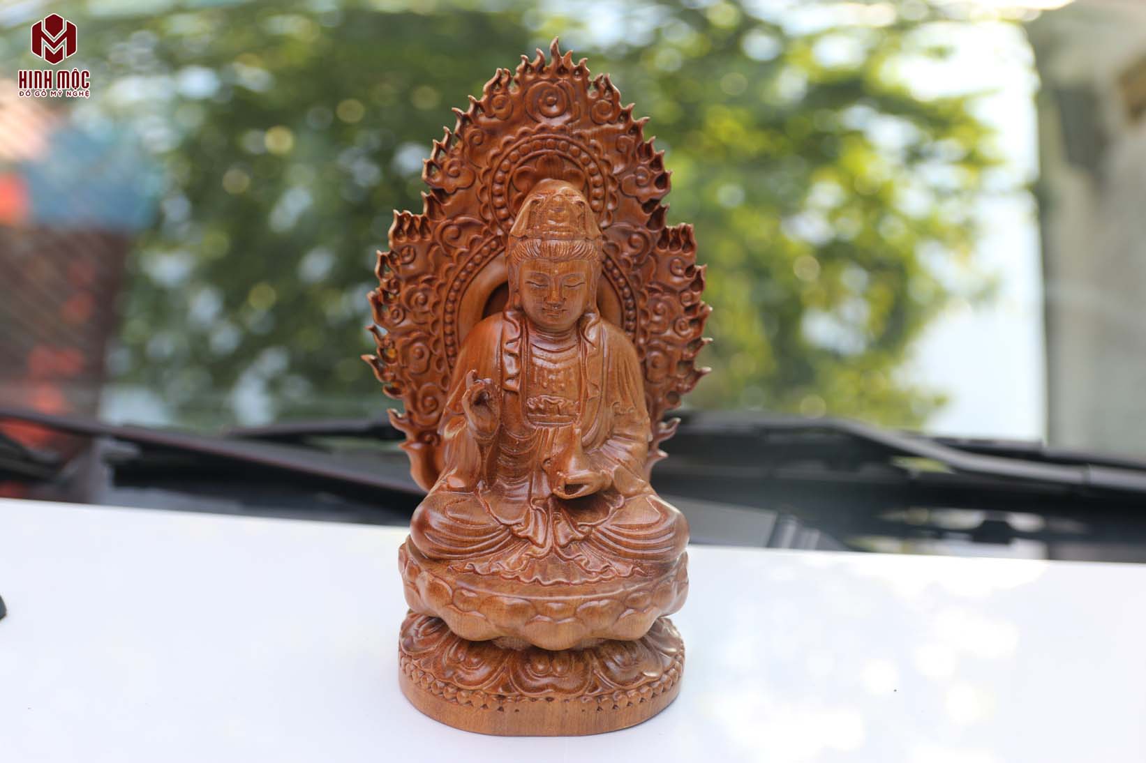 Bồ Tát đặt xe gỗ bách xanh được chúng tôi sơn PU 1 lớp nhẹ bên ngoài để giúp cho sản phẩm được láng mịn, tránh nứt trong điều kiện nhiệt độ cao trên xe.