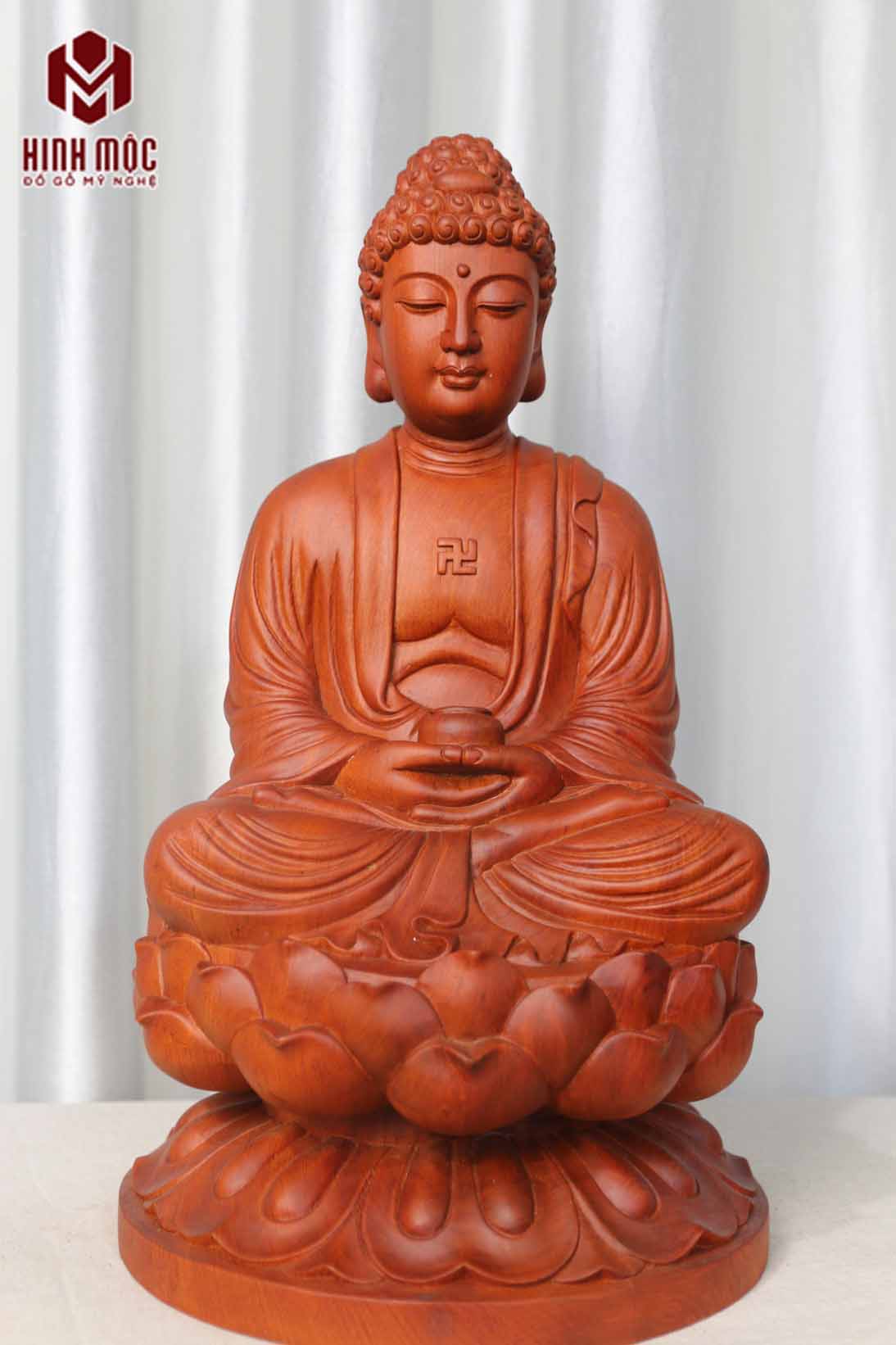 Đây là mẫu tượng được đa số quý thầy, quý phật tử lựa chọn bởi kích thước phù hợp với trang thờ quy mô vừa và nhỏ. Tượng đục bằng máy CNC hiện đại. Bản vẽ thiết kế độc quyền. Tượng đục trên gỗ hương đá nhập khẩu. Gỗ đẹp, tuyển chọn, màu đỏ nâu tự nhiên, vân đẹp, không bám vân trên mặt.